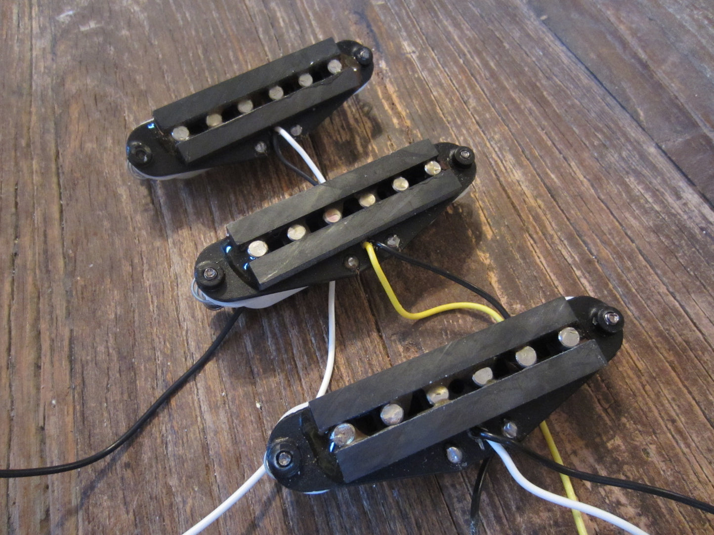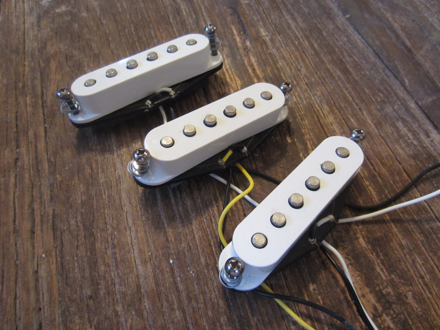 Here's a nice and clean set of Fender Standard Series (MIM) Stratocaster single coil pickups. Each pickup has ample lead for any traditional Stratocaster application, comes complete with springs and screws, and meters between 6.75 and 7.0 kΩ.