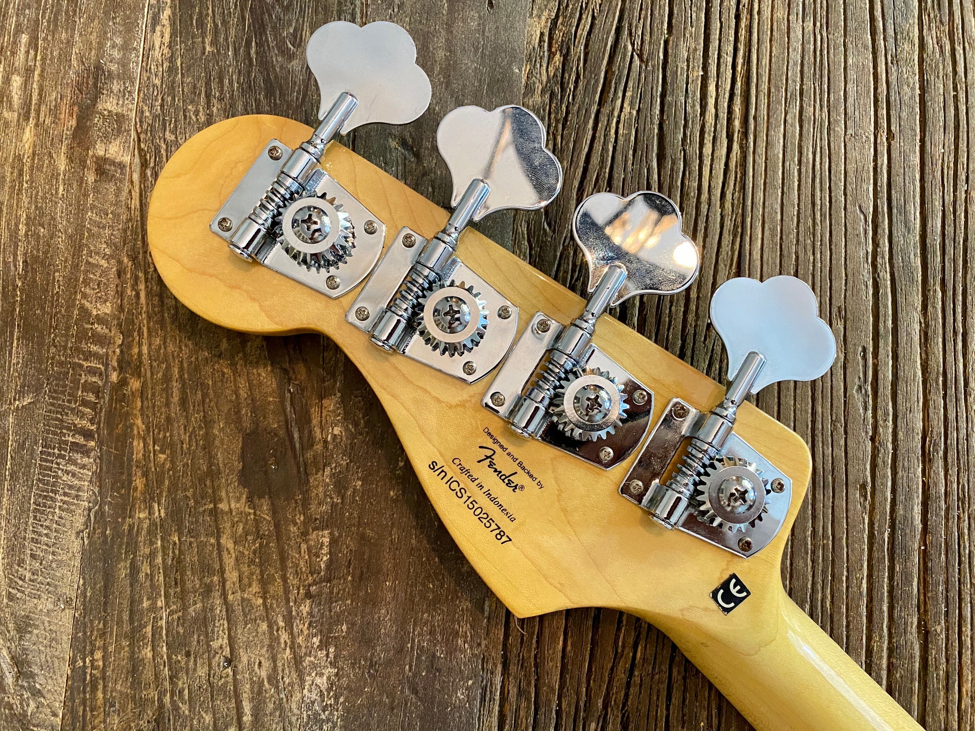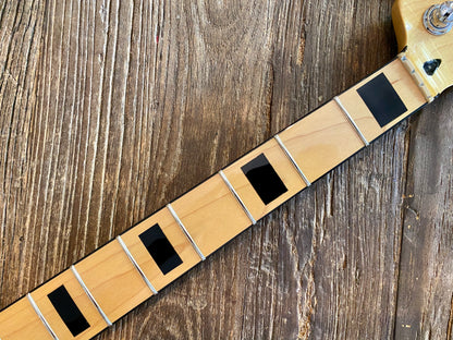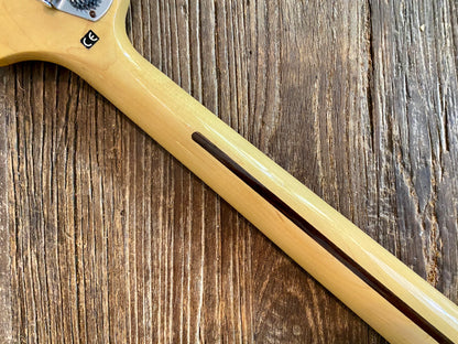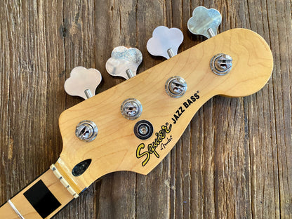 Here's a super nice and clean 2015 Squier by Fender Vintage Modified 70s Jazz Bass neck complete with the original open gear tuners. The neck itself is straight and the truss functions properly. The striking block inlays add a great aesthetic appeal. The frets have been polished and feel great! A perfect piece to finish off your next project!