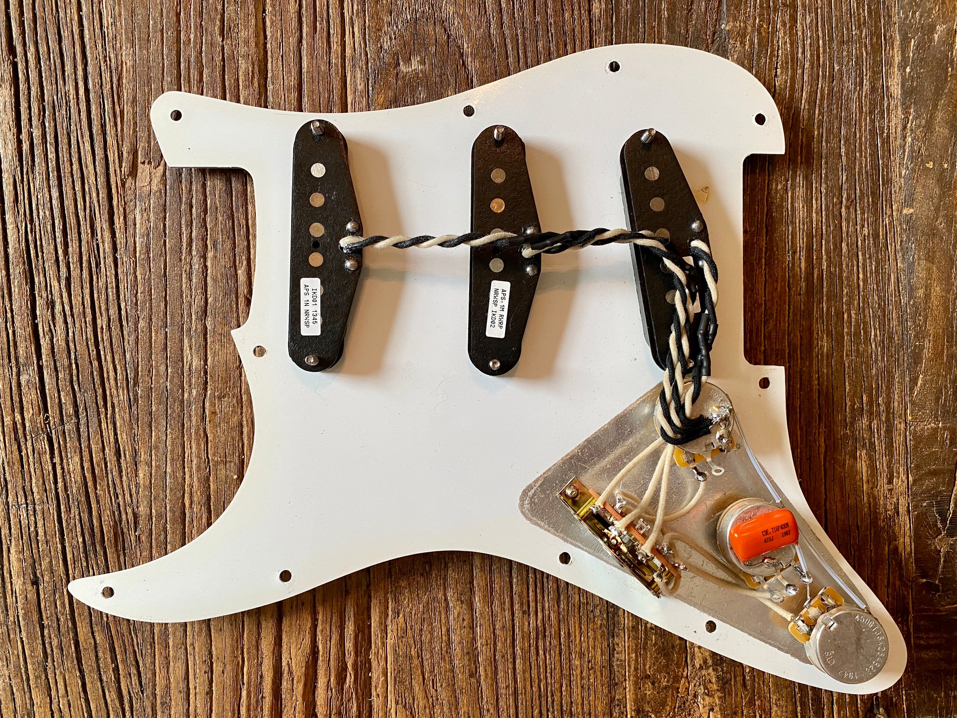 Here's a super nice and clean Seymour Duncan AlNiCo Pro II loaded stratocaster pickguard. The pickups, pickguard, and plastics are used but all show very well. The wiring, pots, switch, and capacitor are all brand new fresh and wired with extreme care and concern. CTS 250 kΩ Pots, Orange Drop .047 µF capacitor, and an Oak Grigsby 5-Way Blade Switch.