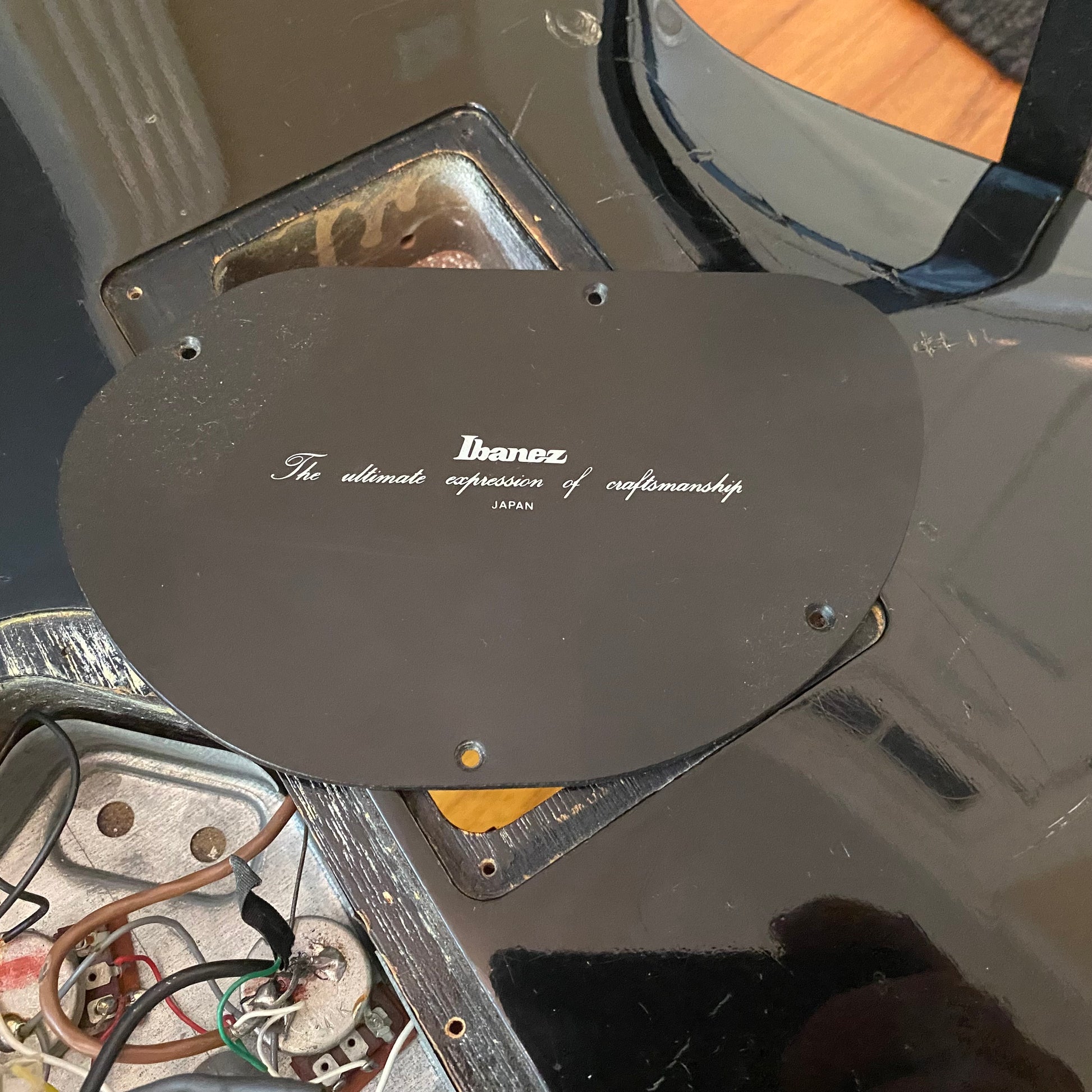 Everything pictured is included. The rear control cavity cover is a bit warped. The tone controls are the original push/pull for coil splitting the factory Dimarzio Dual Sound pickups. Two of the Sure-Grip knobs are missing their rubber collars - the other two are in great shape. The tuners are the original and Ibanez branded.