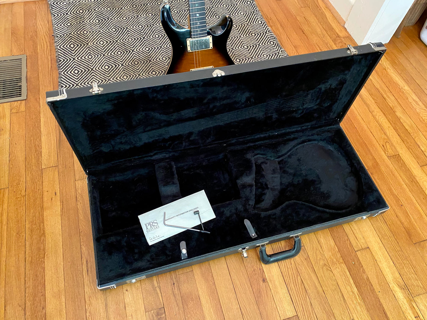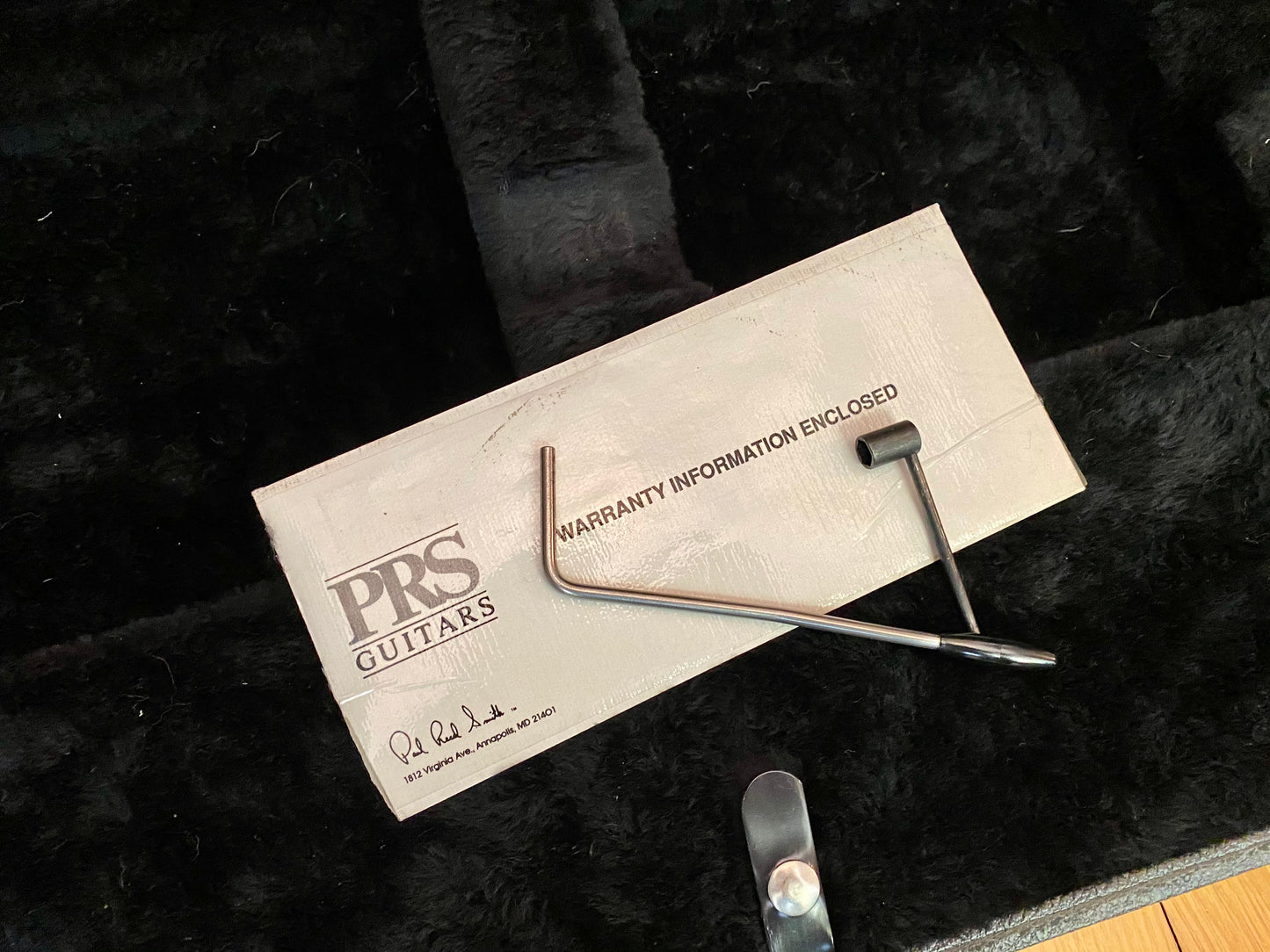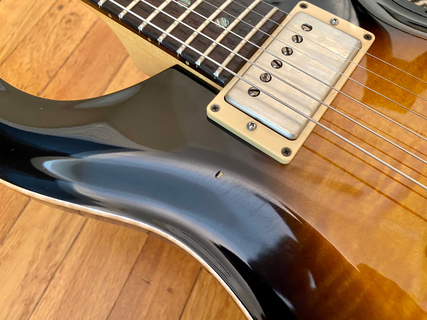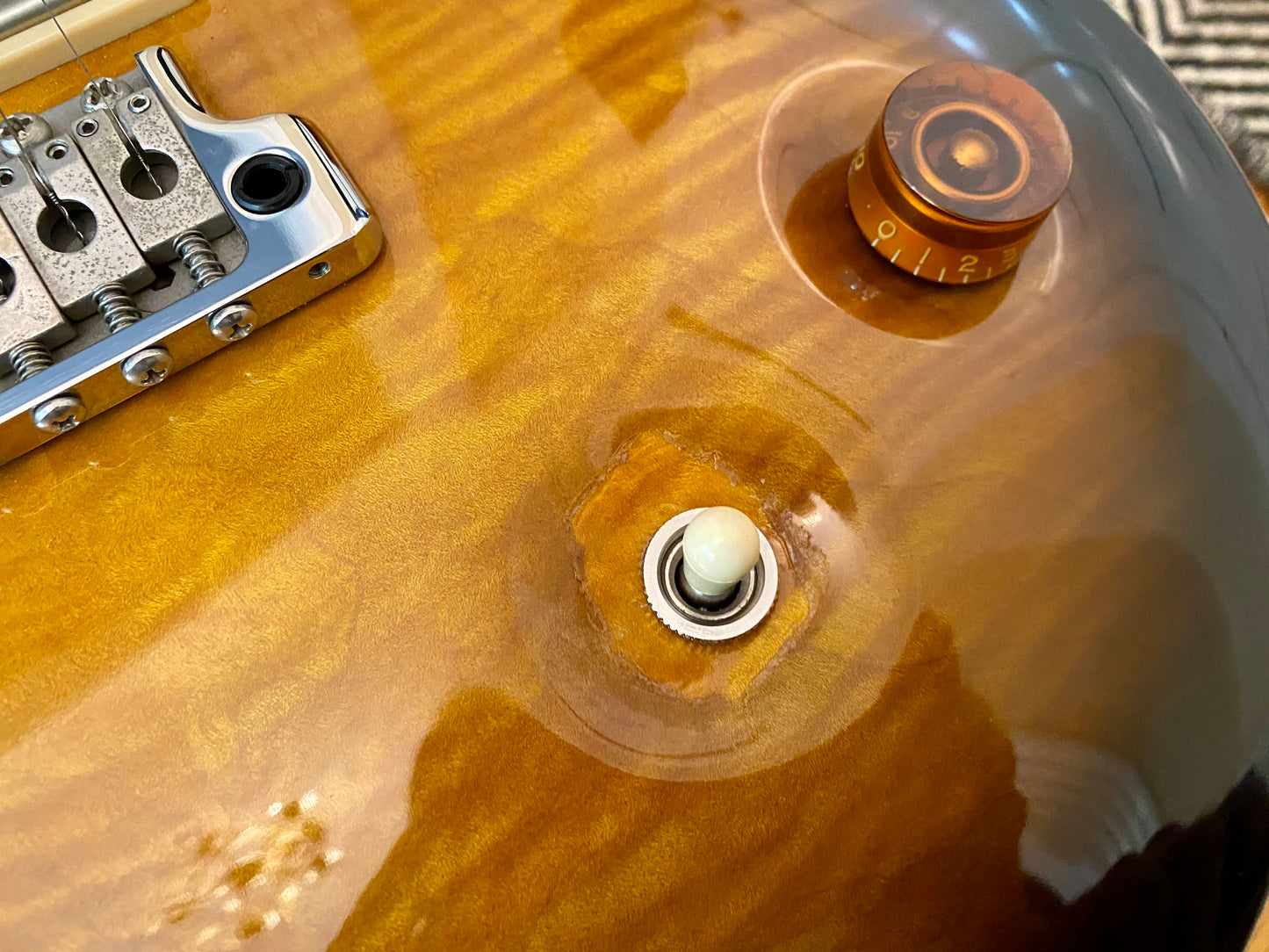 The wiring has been replaced with a PRS McCarty Wiring Harness with Push/Pull Tone Control by a previous owner. The clear coat was peeling around the toggle mounting hole and was touched up with a nitro touchup pen - also by the previous owner. Not the prettiest repair, but easy to remove in the event of a more suitable solution.