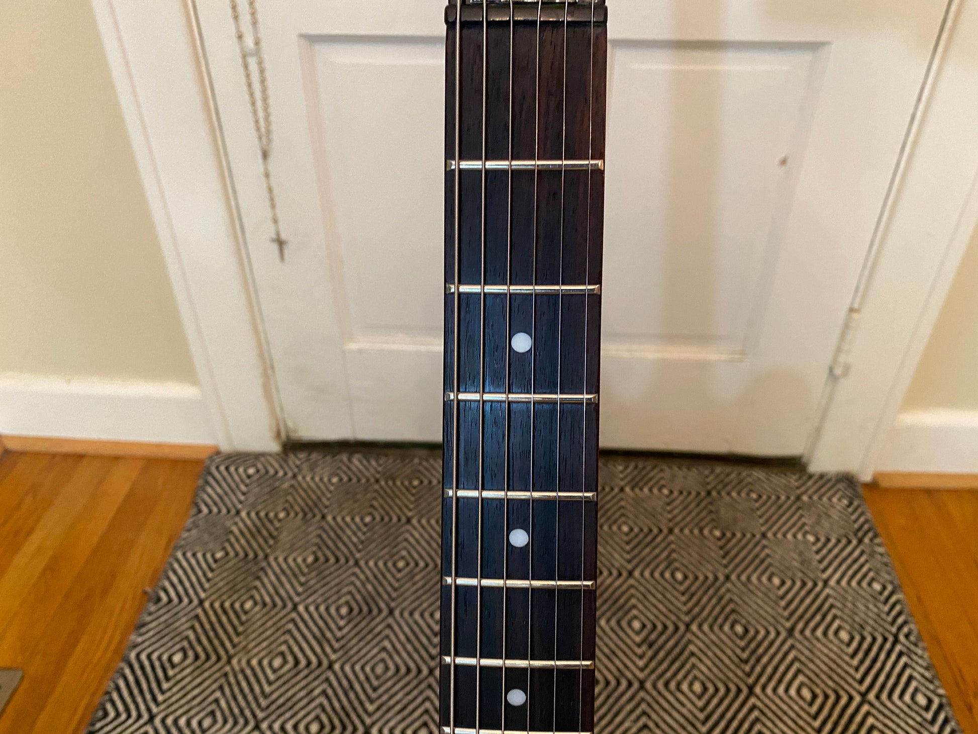The neck is straight and truss rod functions properly. The frets have been polished and the fingerboard as been cleaned and conditioned.