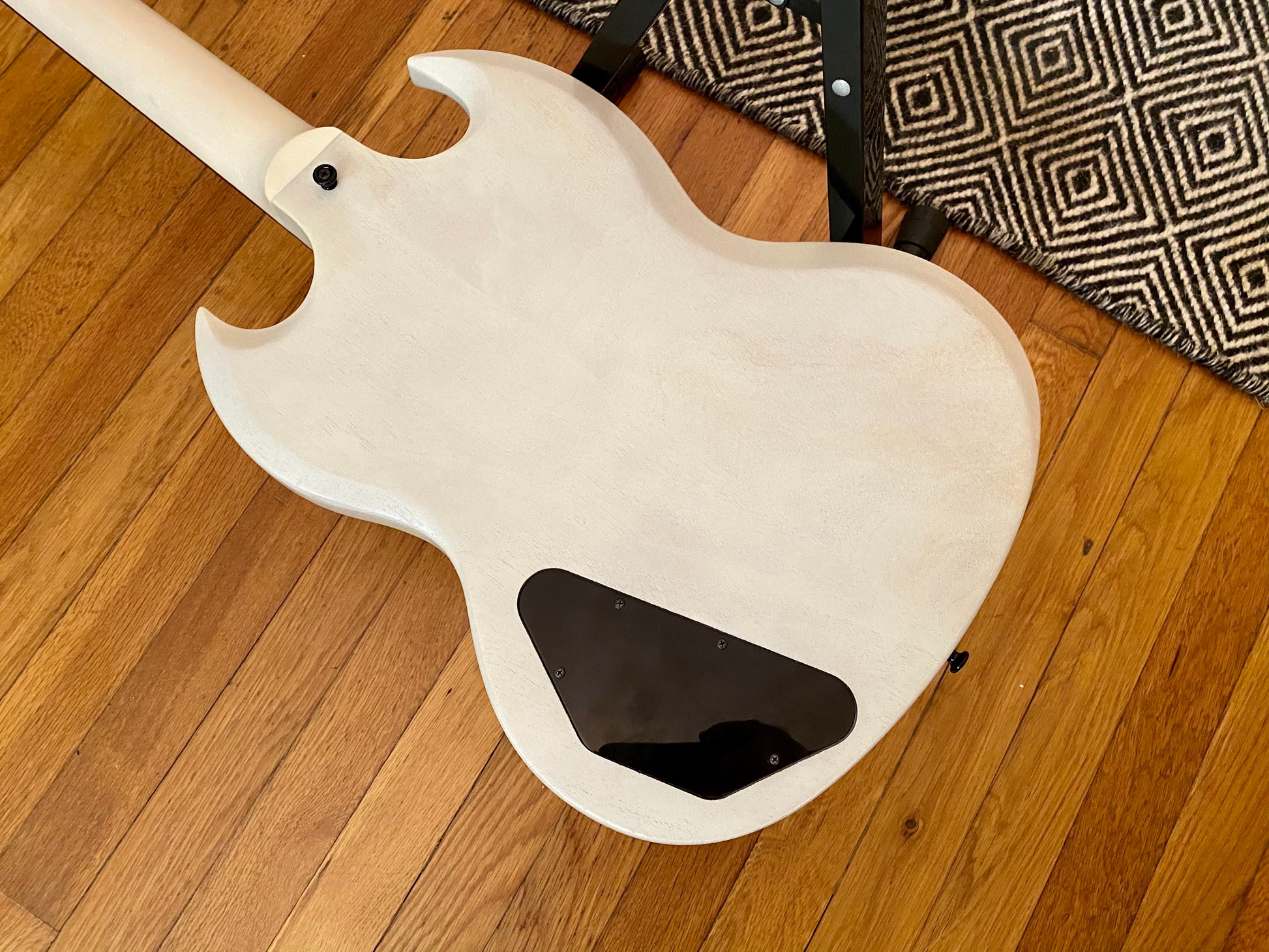 This could be the perfect platform for your next SG project. Comes with pickup rings, rear cavity cover, and truss rod cover.
