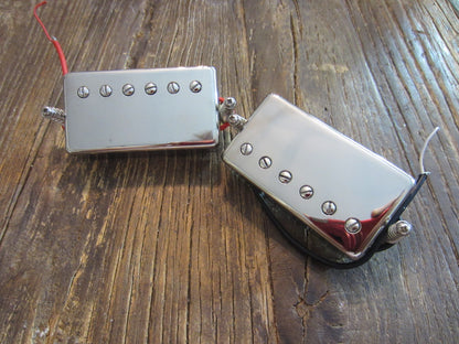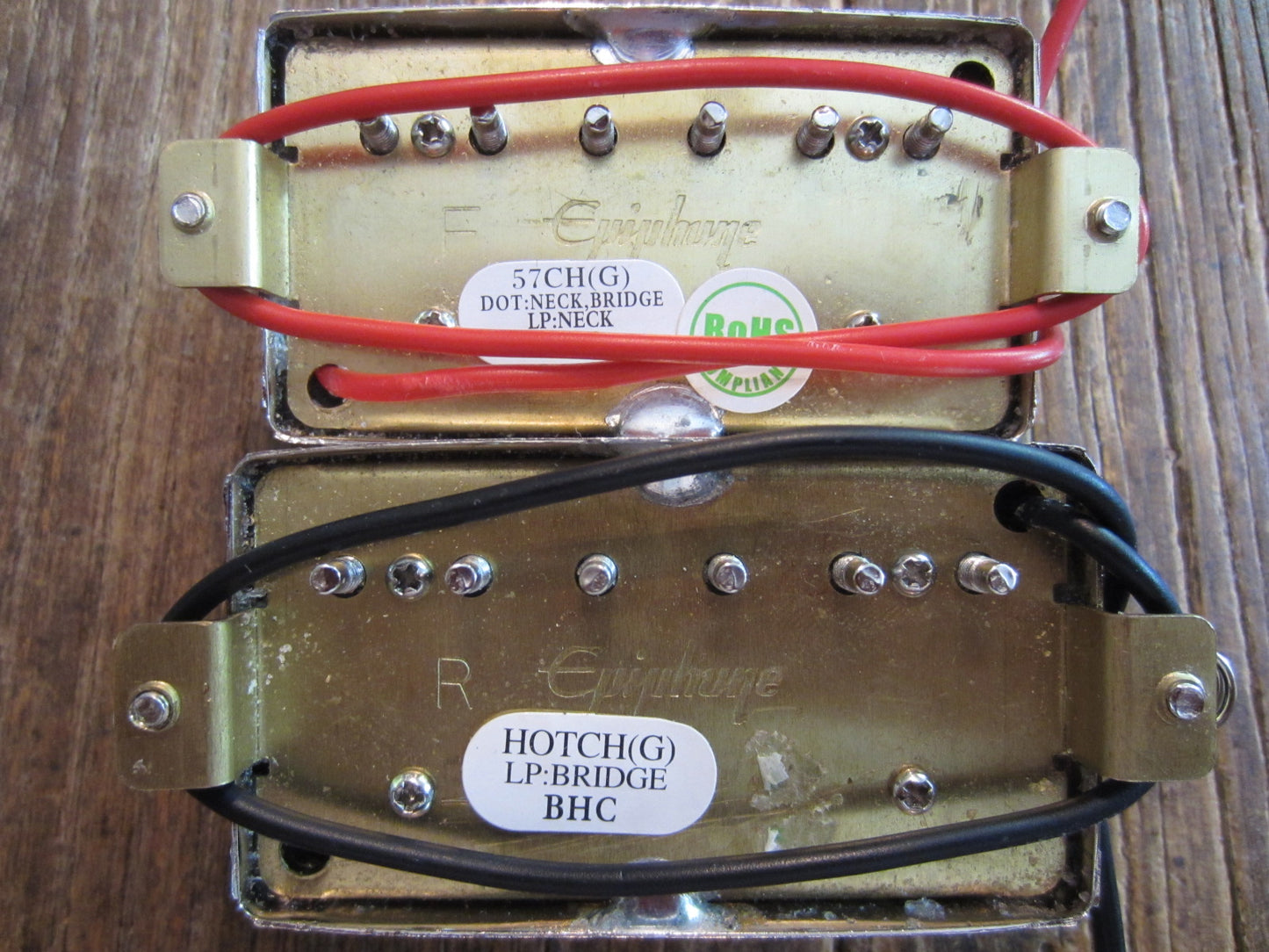 Here's a nice and clean set of Epiphone humbuckers with chrome covers complete with springs and screws. The leads are long enough for any Les Paul type application. The 57CH neck pickup meters at 8.43 kΩ DCR. The HOTCH bridge pickup meters at 13.92 kΩ DCR.