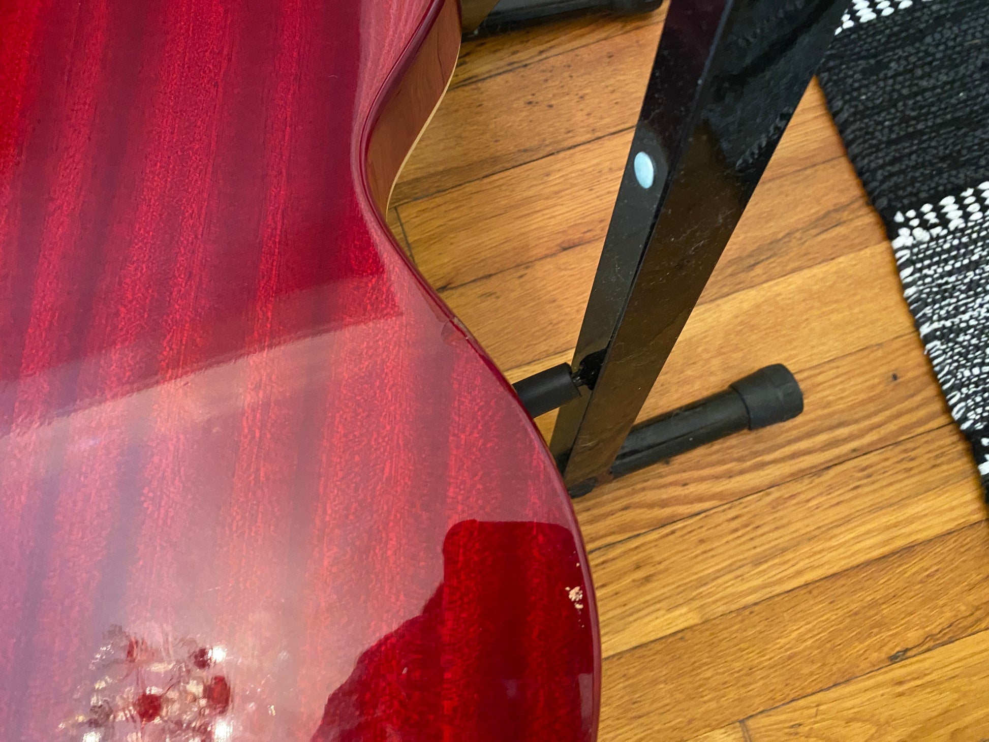 Here's a great playing 2012 Epiphone Les Paul Standard Pro (Coil Splitting Volumes for each humbucker). And while it is a great playing guitar it does have some more significant blemishes that have been clearly pictured - most notably, some damage on the lower bout. The pickup covers have some light wear and tarnish and the bridge pickup's screws have a fair amount corrosion.