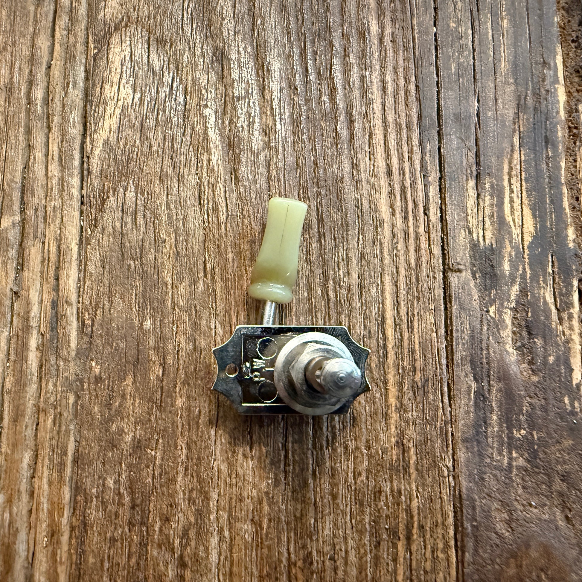 Here's a nice set of tuners from a Gibson USA Les Paul or similar 3+3 style headstock. Nickel finish w/ opaque mint green keystone tuning buttons. One of the treble side machines has a bent shaft that has been clearly pictured. All tuning machines function properly with consistent feel in rotation - no binding of any kind.
